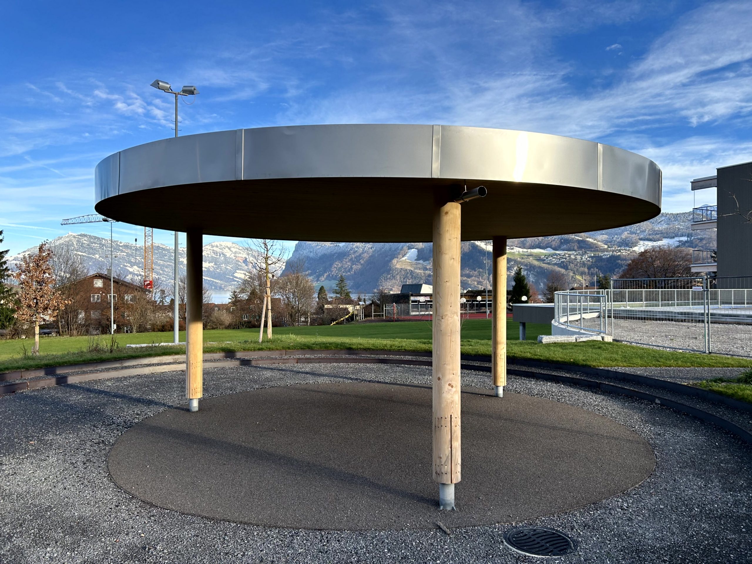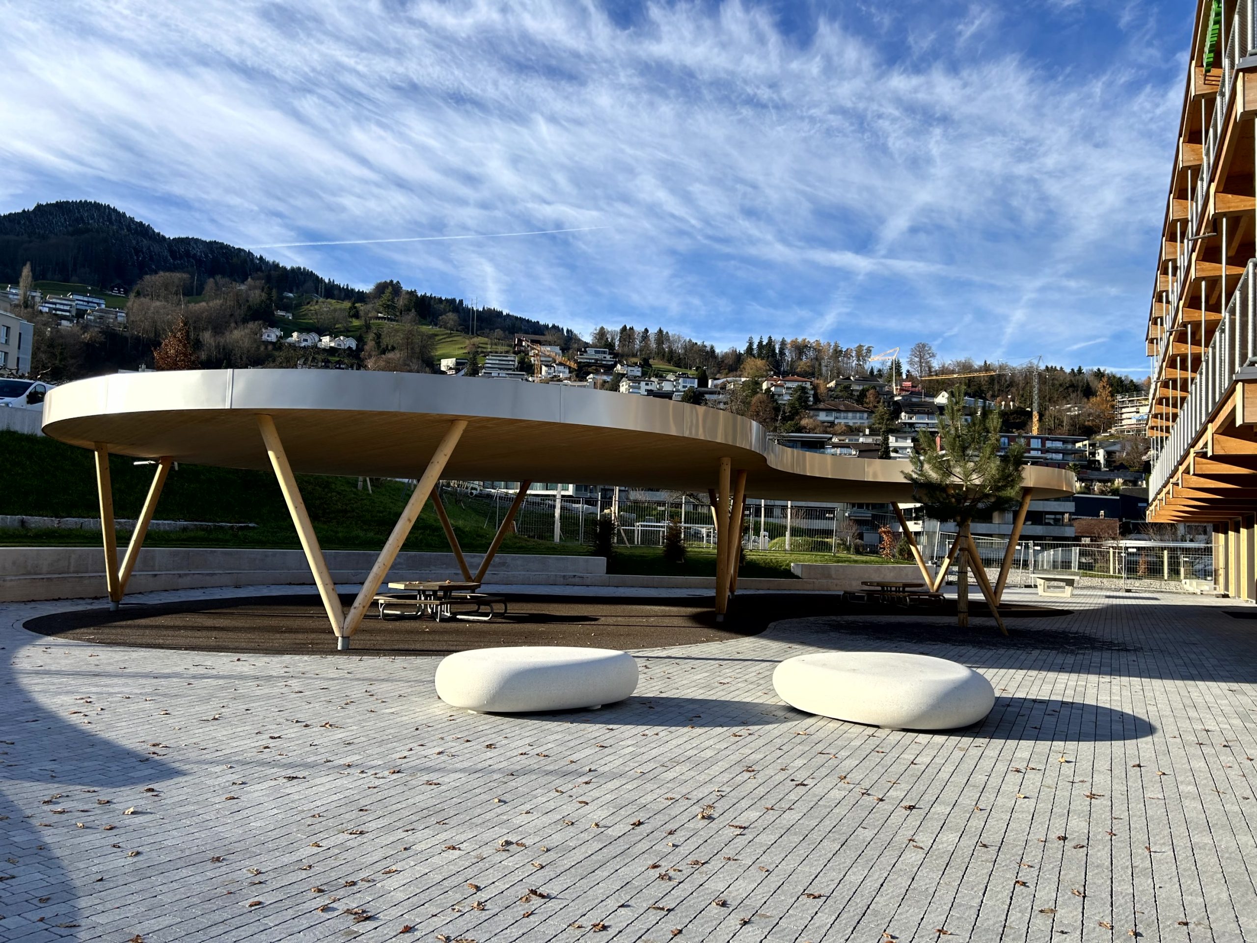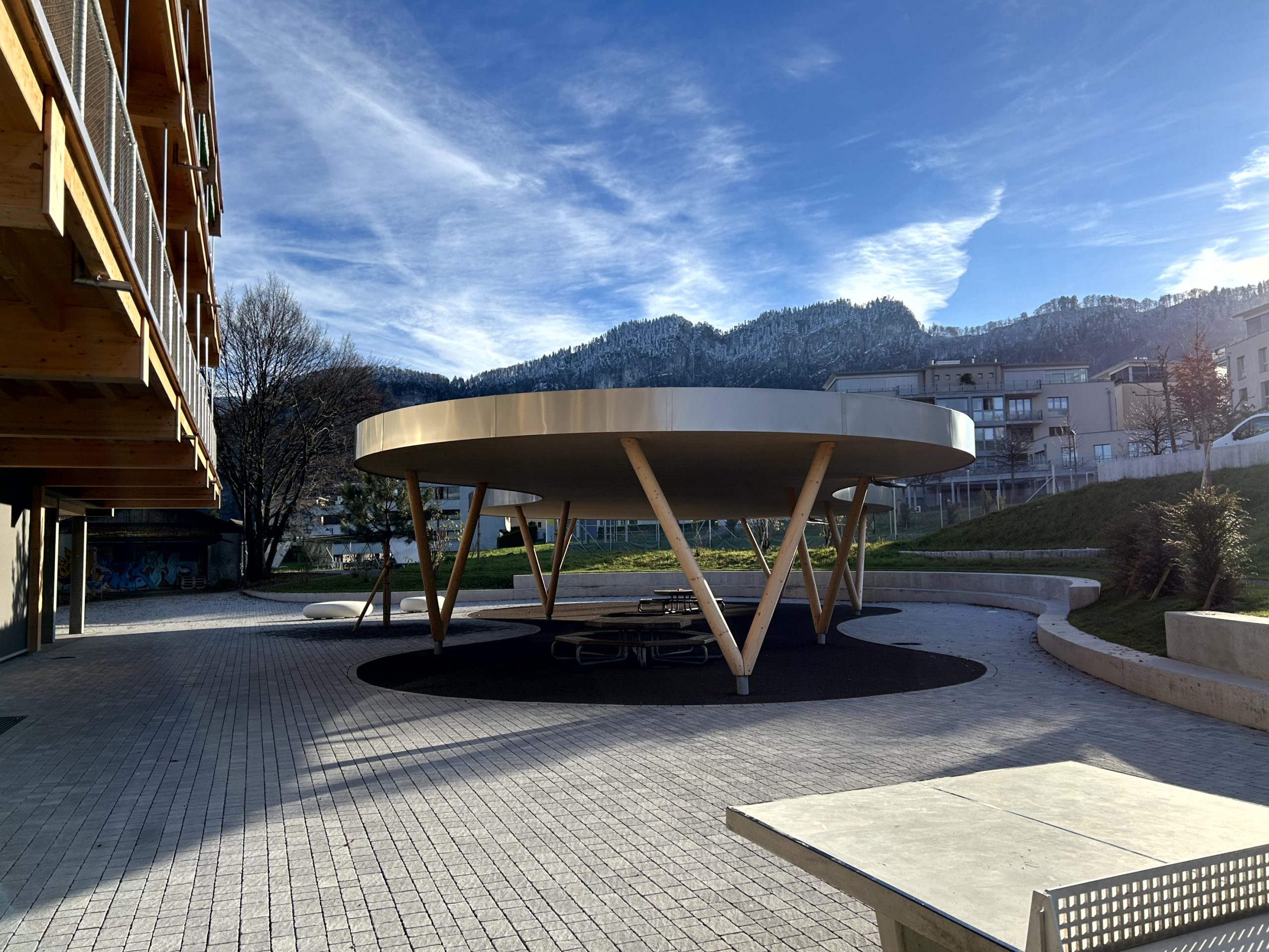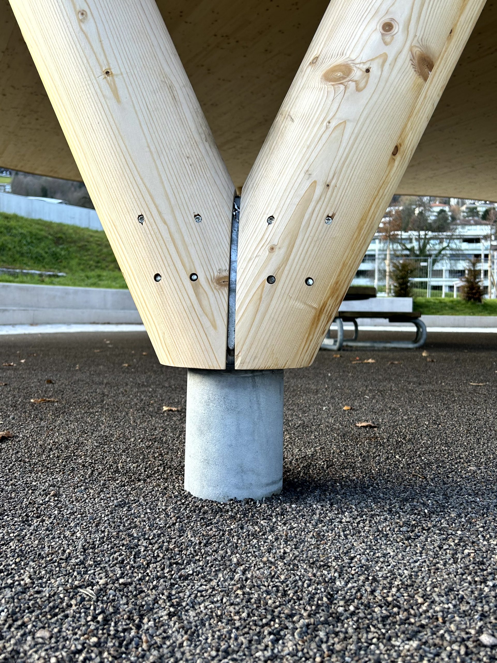 Ein architektonisch schön gestalteter Schulhof für die Mittelstufen 1 + 2 in Obermatt, Hergiswill mit fertig abgebunden Rundstützen aus unserer Herstellung. Schön wenn Holzbau mit einer anspruchsvollen statischen Lösung zu einer so leichten und überzeugenden Gestaltung beitragen darf.